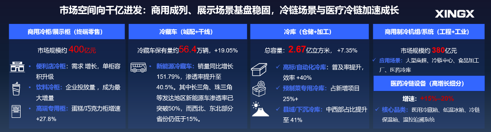 当前商用制冷市场正加速迈向千亿规模,整体呈现传统场景稳健盘底、新兴赛道全面爆发的增长格局。商用冷柜/展示柜作为终端零售的核心基础盘,市场规模约400亿元,其中饮料冷柜为最大增量引擎,便利店冷柜持续向大容积方向升级,高端专用柜以高增速领跑细分品类;冷藏车领域,新能源车型渗透率大幅提升,成为行业增长核心动力;冷库领域,高标自动化冷库、预制菜专用冷库、中西部下沉冷库成为核心增长引擎,带动行业容量持续扩容,成长空间广阔。