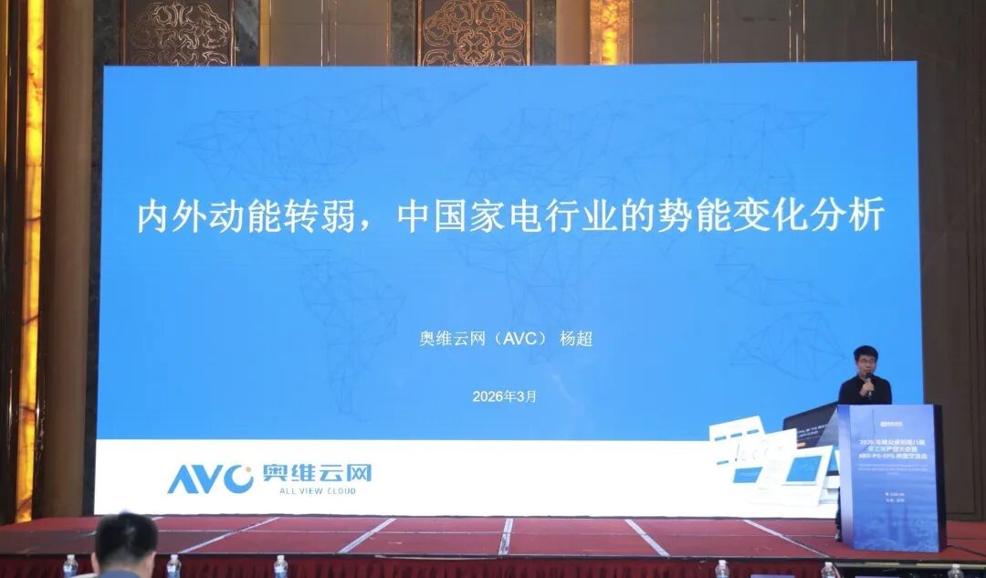 3月17日,奥维云网(AVC)大家电事业部副总经理杨超受邀出席2026年隆众资讯第八届苯乙烯产业大会暨ABS-PS-EPS供需交流会,带来《内外动能转弱,中国家电行业的势能变化分析》主题报告,分享中国家电行业及暖通产业的发展趋势,以及对全球产业供应链的传导效应。