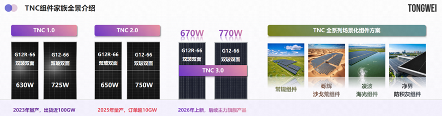 在发布TNC 3.0多分片组件的同时,通威“砾辉”沙戈荒组件、“凌波”海光组件、“净界”防积灰组件等场景化产品集中亮相,意味着通威正在从“制造竞争”走向“生态竞争”,从“参数对抗”走向“方案输出”。