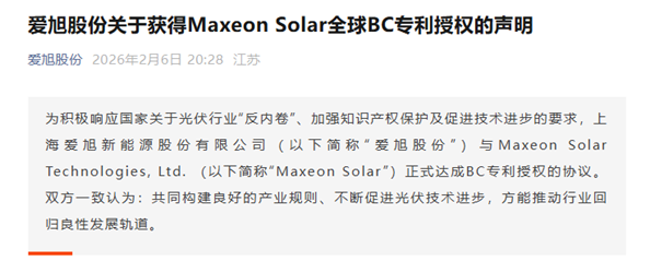 2026年2月6日,爱旭股份发布声明,与Maxeon Solar达成全球BC专利授权。