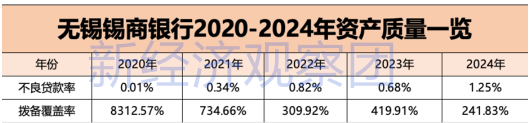 除了业绩层面的隐忧,锡商银行在资产质量方面同样表现出一定的波动性。尽管初期由于成立时间较短,不良贷款率保持在极低水平,但随后几年里,随着业务规模的迅速扩张,该行不良贷款率逐渐上升。2020年至2024年间,该行不良贷款率从0.01%逐步攀升至1.25%,资产质量面临的挑战日益增加。