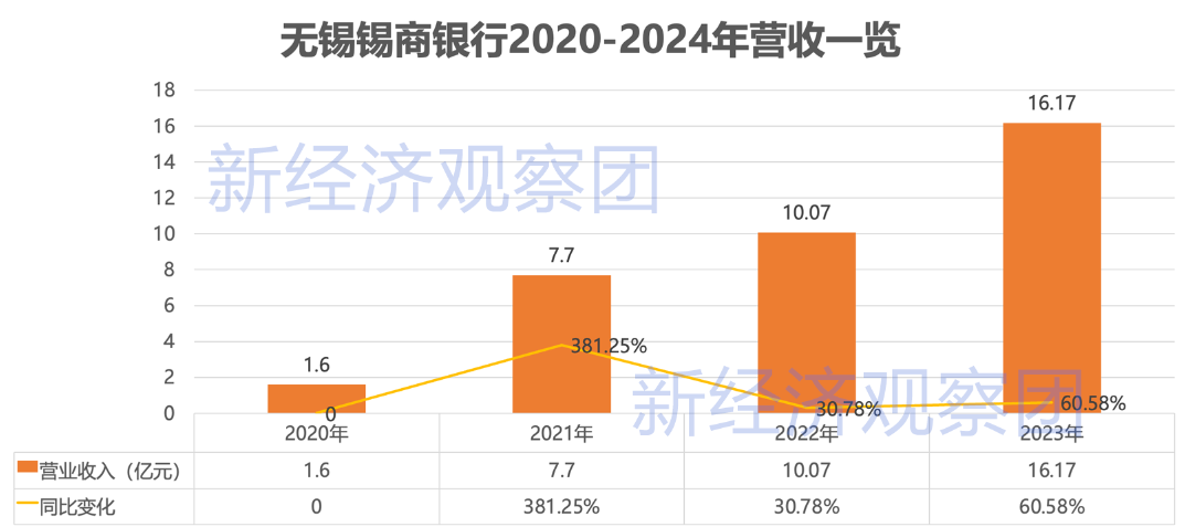 进入2023年,锡商银行增速达到阶段性高点。全年营业收入录得16.17亿元,较上年增长60.58%;净利润提升至3.87亿元,同比增长44.94%。此时,锡商银行已成为江苏省内资产增速较快的民营银行之一,在同类机构中初步形成一定市场存在感。