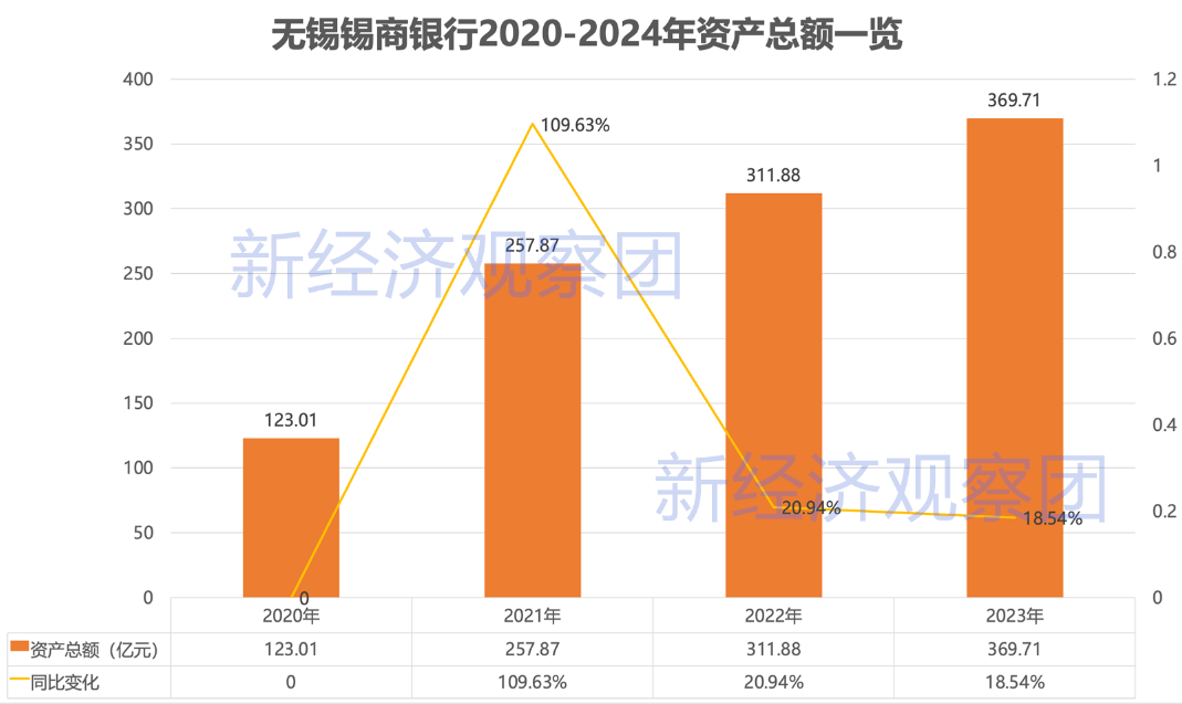 于2019年经原中国银保监会批准筹建,2020年正式开业,是江苏省第二家民营银行,由红豆集团等本地民营企业发起设立,定位为服务中小微企业和个人客户的区域性法人银行。随着业务不断扩张,锡商银行的资产水平也水涨船高,由2020年的123.01亿元一路飙升至2024年末的369.71亿元,四年时间增长幅度达到200.55%。