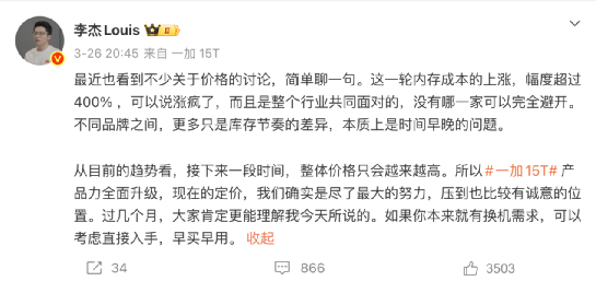对此,一加中国区总裁李杰认为,“这一轮内存成本的上涨,幅度超过400%,可以说涨疯了,而且是整个行业共同面对的,没有哪一家可以完全避开。不同品牌之间,更多只是库存节奏的差异,本质上是时间早晚的问题。”