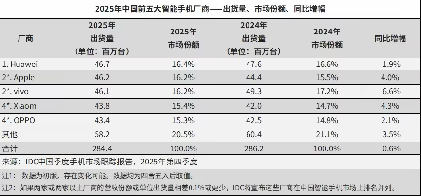IDC披露的数据显示,2025年中国手机市场,华为手机出货量为4670万台,占据16.4%的市场份额,时隔五年重返榜单第一。