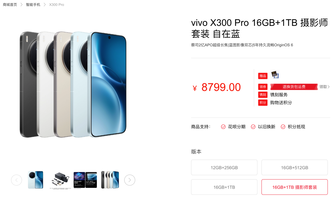 在此背景下,一众智能手机厂商纷纷通过涨价的方式,向消费者市场转移成本压力。比如,2025年10月问世时,vivo X300 Pro 16GB+1TB摄影师套装版售价8299元,如今该产品售价已上涨500元至8799元。
