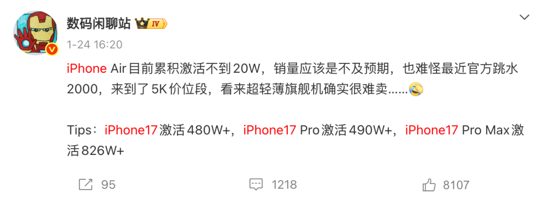 以iPhone为例,“数码闲聊站”披露的数据显示,截至2026年1月,iPhone 17系列中国市场总激活量约为1816万台,其中iPhone 17 Pro Max约826万台,占比45.48%;iPhone 17 Pro约490万台,占比26.98%;iPhone 17约480万台,占比26.43%;iPhone Air约20万台,占比1.1%。