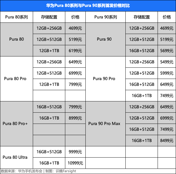 其中,华为Pura 90标准版起始容量为12GB+256GB,售价4699元,看齐Pura 80标准版;Pura 90 Pro起始容量为12GB+256GB,售价5499元,比Pura 80 Pro起售价便宜1000元;Pura 90 Pro Max起始容量为12GB+256GB,售价6499元,比Pura 80 Pro+起售价便宜1500元。