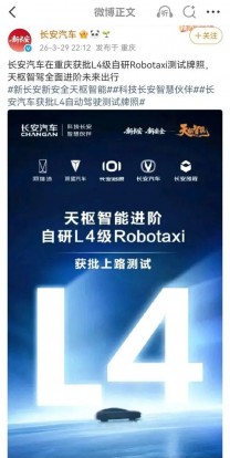 长安汽车拿下L4自动驾驶测试牌照:3个月前刚拿到全国首块L3号牌,这次直接“跳级”了