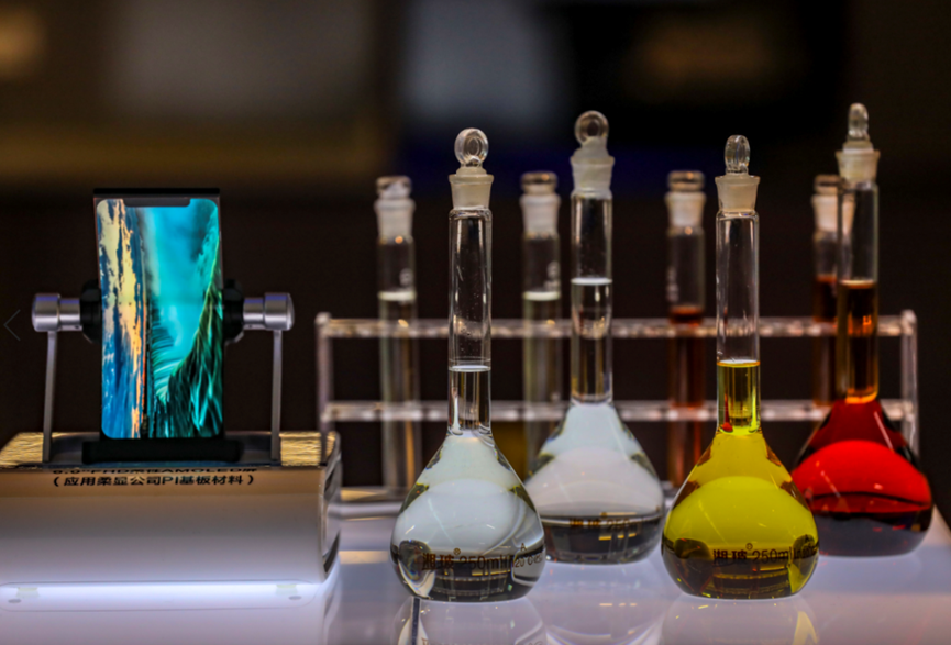 在鼎龙股份柔性显示材料展台前,一排装有各色透明小瓶的材料静静摆放着——它们看似普通,却是OLED屏幕背后的关键一环,包括柔性OLED用基板材料(CPI、YPI)以及光刻胶(PSPI)。