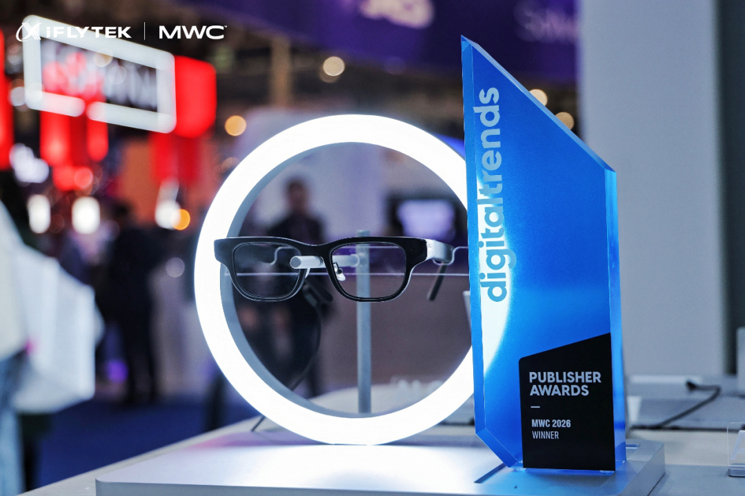 ▲讯飞AI眼镜在MWC 2026获得DigitalTrends(DT)颁发的Digital TrendsTopTechof MWC Awards